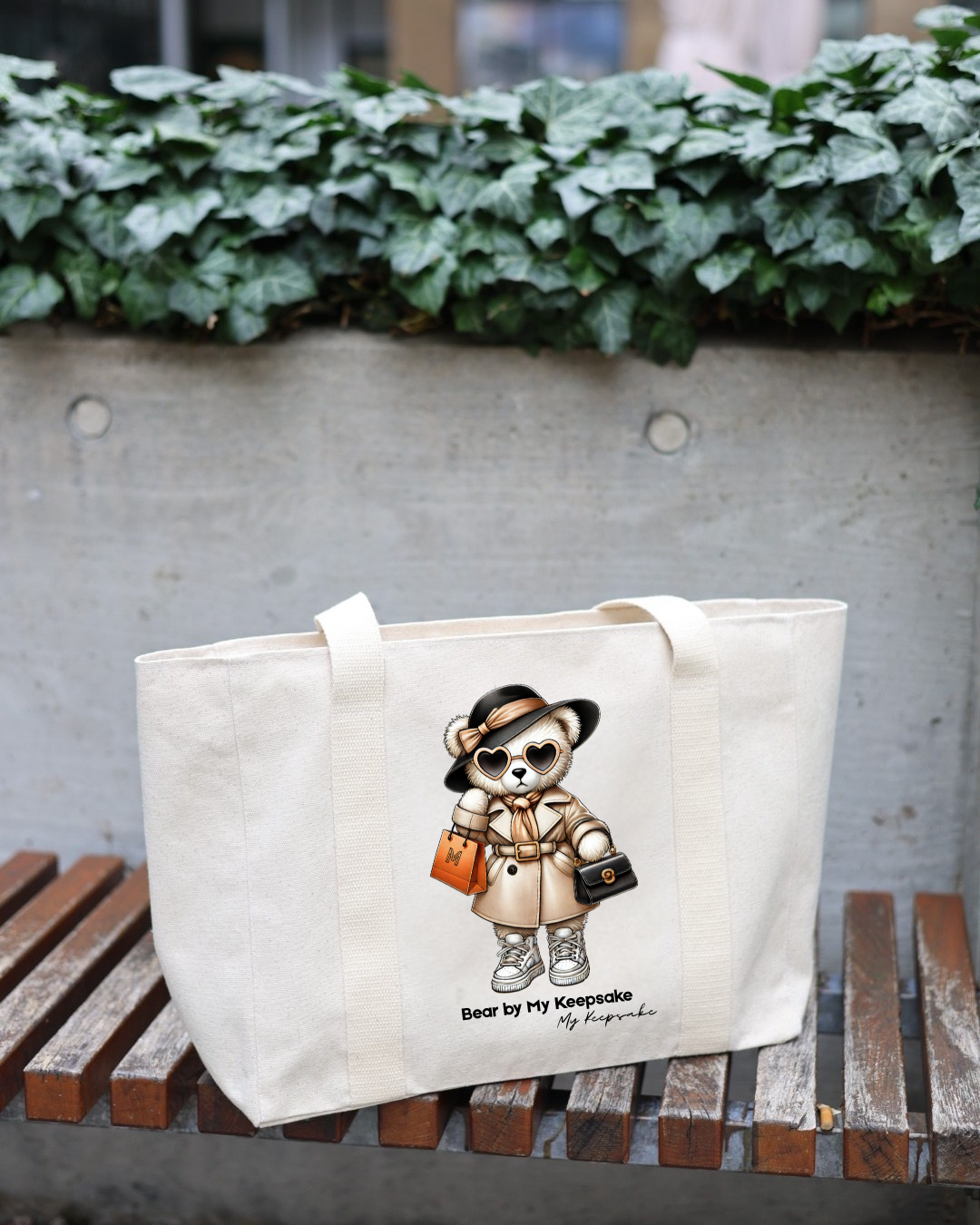 Plátěná taška Miss Bear by My Keepsake je víc než jen praktický doplněk — je to lokální design s příběhem. Autorský potisk módního medvídka v elegantním trenčkotu a s luxusními doplňky dodává tašce osobitý a trendy výraz, který zaujme na první pohled.