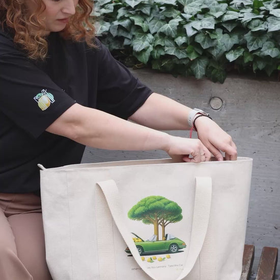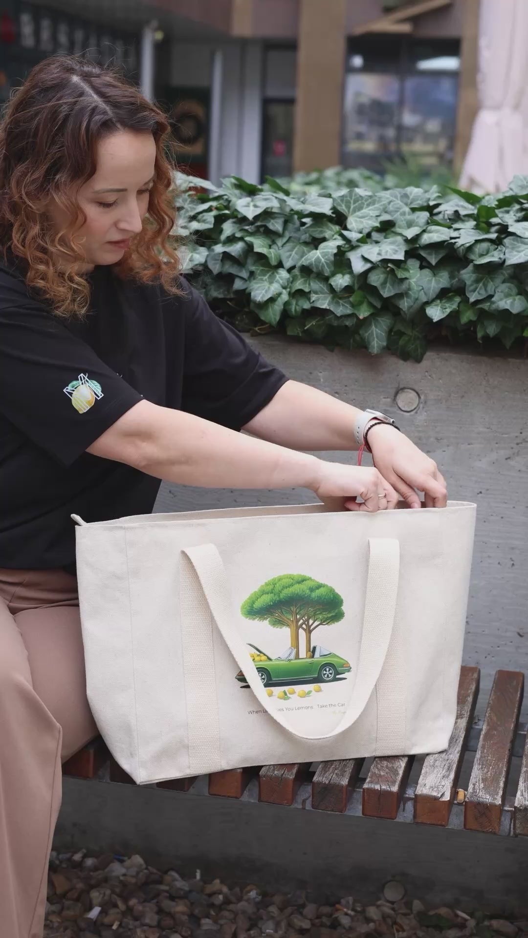 Plátěná taška Take the Car je víc než jen praktický doplněk — je to lokální design s charakterem. Autorský potisk auta s citrony a stromem dodává tašce hravý, ale stylový výraz, který zaujme na první pohled.