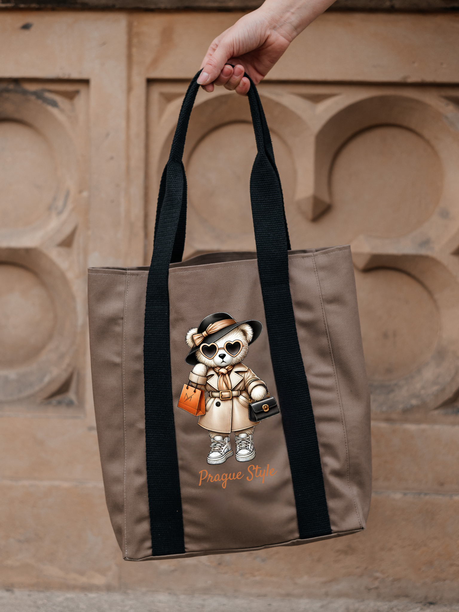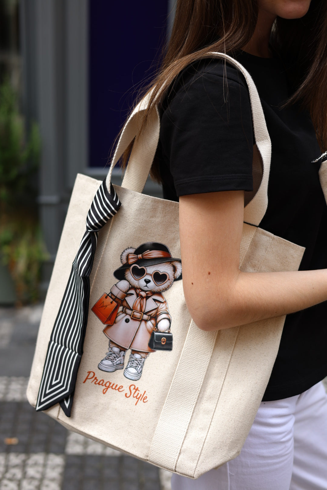 Виготовлена зі 100% бавовни та пошита вручну в Чеській Республіці , вона пропонує просторий формат, міцні вушка та натуральний матеріал. Стильний принт модної жінки-ведмедиці в празькому стилі на мізинці робить її оригінальним аксесуаром та популярним сувеніром.